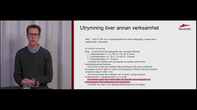 Följande film togs fram i samband med ett webbseminarium om införandet av nya brandskyddsregler. Filmen ger ingen fullständig genomgång av reglerna om utrymning, men tar upp vanliga principer och frågor om reglernas tillämpning på området.