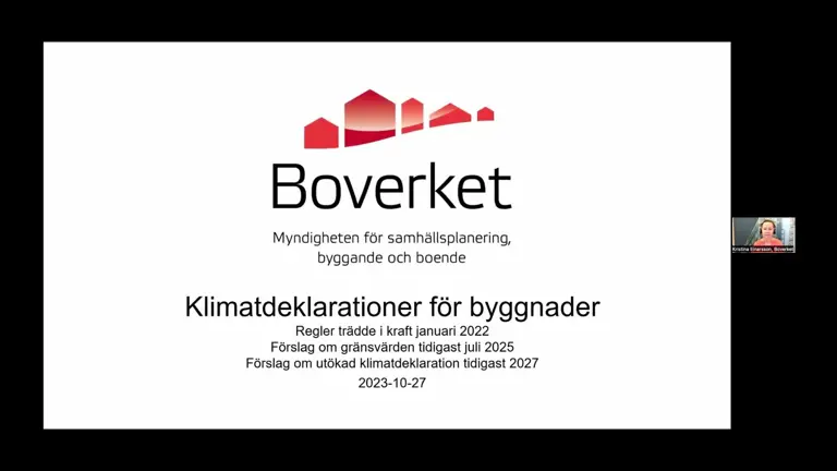 Den 27 oktober 2023 sändes Boverkets fördjupande webbseminarium om klimatdeklaration för nya byggnader. Seminariet innehöll korta föreläsningar och avslutades med en frågepanel med Boverkets projektgrupp för klimatdeklarationer.